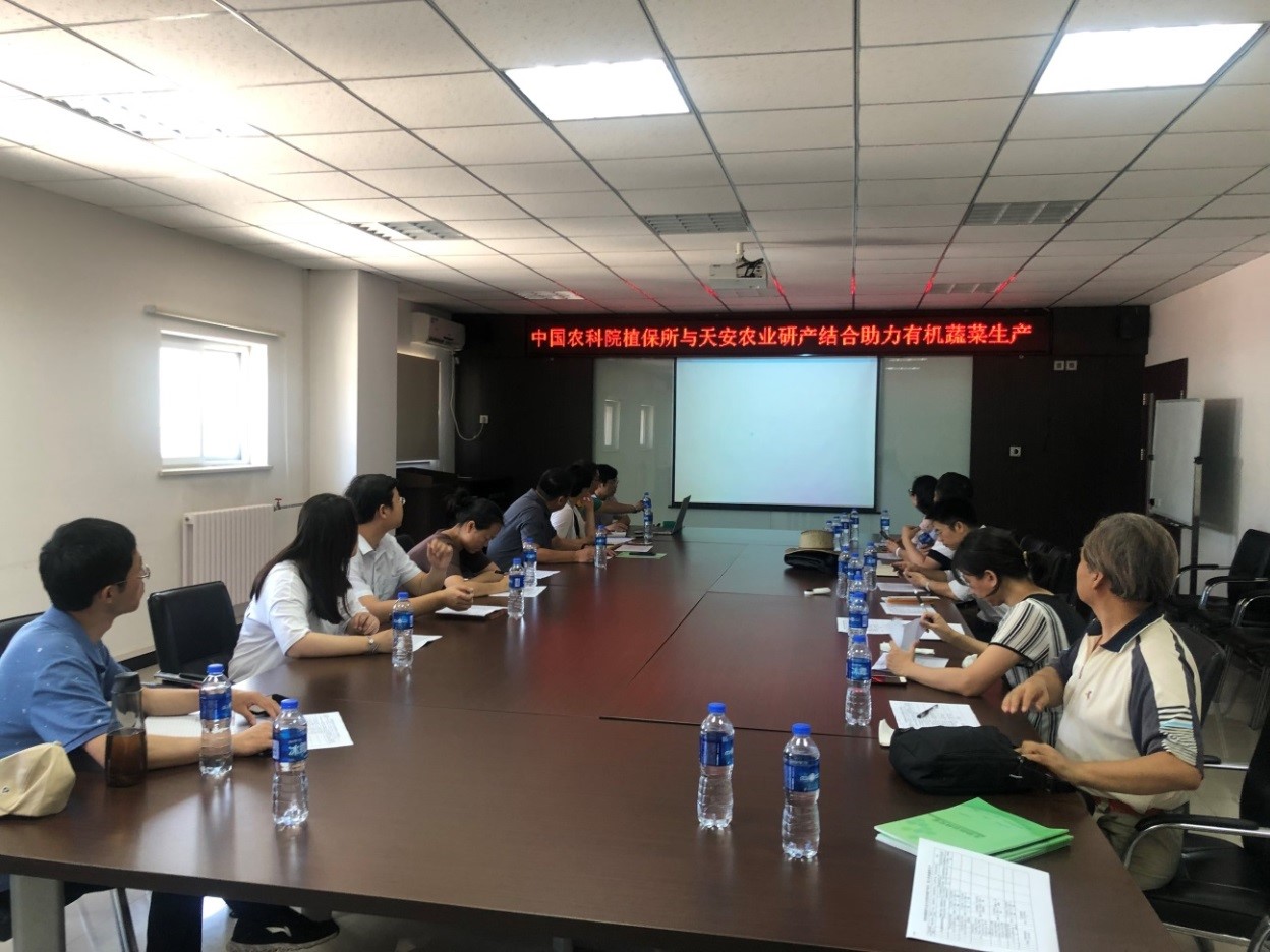 为深入贯彻“不忘初心、牢记使命”主题教育部署要求,认真执行“三会一课”支部建设制度,不断加强党建业务互促发展,7月12日,植保所科研四支部赴昌平天安农业有机蔬菜种植基地开展“研产结合,助力有机蔬菜生产”的主题党日活动。会议由天安农业董事长林源,植保所科研四支部党支部书记徐学农主持,天安农业发展有限公司总经理张兴敏、生物防治研究室相关技术专家及天安农业发展有限公司基地管理人员等17人参加座谈。