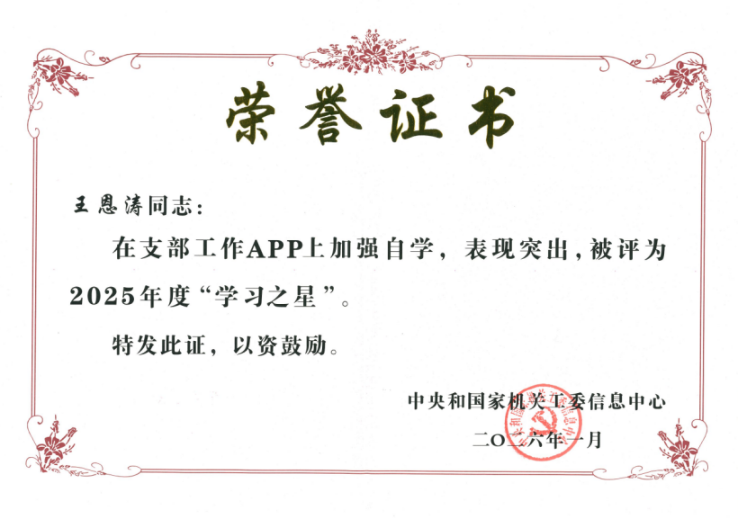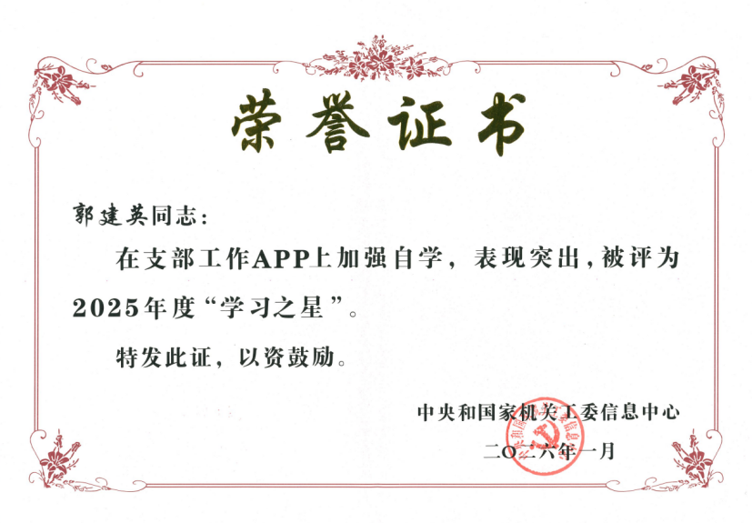 近日,从中央和国家机关工委信息中心传来喜讯,在2025年度“支部工作”APP学习评比中,植保所郭建英和王恩涛同志,凭借全年自学满分的优异成绩,荣获2025年度“学习之星”荣誉称号。