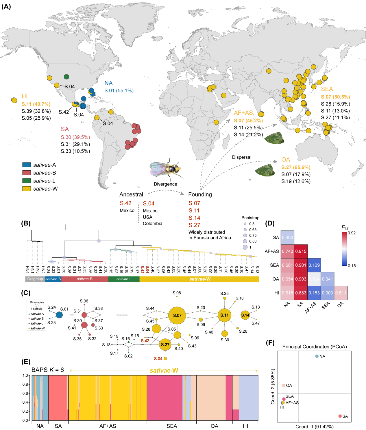 美洲斑潜蝇Liriomyza sativae是全球危害蔬菜和观赏植物的重要入侵害虫,1994年入侵我国。本研究基于21个国家的952条COI序列重建其全球谱系格局,发现美洲斑潜蝇4个谱系中只有sativae-W是全球入侵优势谱系,墨西哥是其祖先单倍型的来源地和全球入侵扩散的重要风险源,马来西亚、巴布亚新几内亚、夏威夷等地在其跨境入侵扩散过程中发挥了“桥头堡”作用。全球基因流网络分析表明,美洲斑潜蝇具有明显的远距离跨大洲的传播扩散特征,可能受国际贸易或受害植株材料调运等人类活动驱动。进一步结合我国15个地理种群146份样品的SNP数据发现,华南沿海地区是美洲斑潜蝇在我国入侵扩散的重要“桥头堡”,总体呈现由南向北、由沿海向内陆传播扩散的趋势。值得关注的是,该物种在扩散过程表现出明显的环境变化响应和适应性进化。基于全球分布记录分析原产地与入侵地的生态位动态,发现入侵种群对低温的耐受能力显著提升。基因型-环境关联分析检测到多个与降水、低温和海拔等环境因子相关的候选适应位点,表明该物种具备在新环境中快速适应的能力,以及向高纬度、低温地区持续入侵扩散的遗传基础。