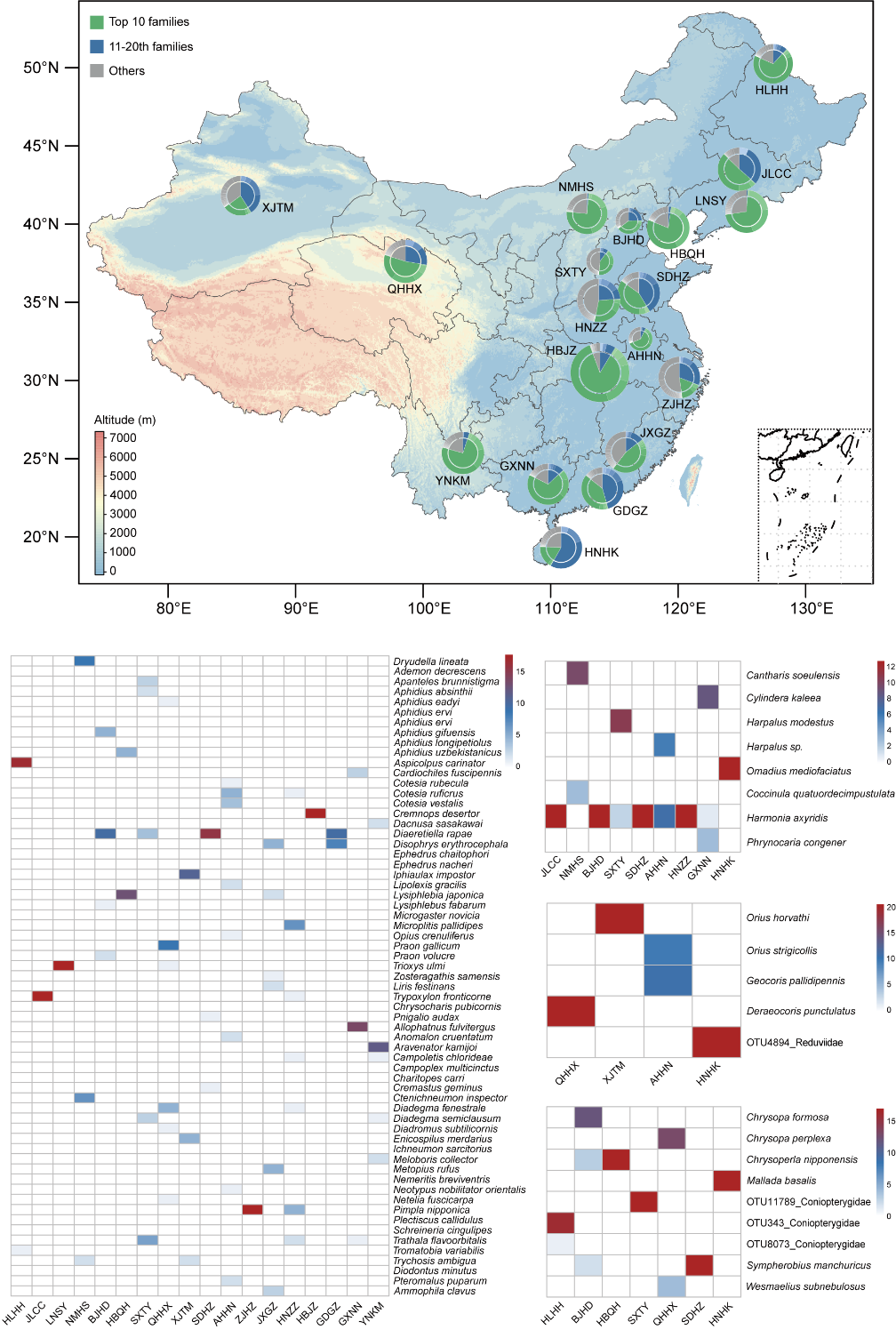 基于2019年全国20个天敌昆虫观测点的系统调查,研究DNA宏条形码技术对当地昆虫样本进行高通量分析,共获得了1256个属级分类单元,鉴定出584种已知昆虫物种,其中包含185个天敌生物类群。研究还解析了我国农业生态系统中昆虫的地理分布格局,不同地理区域间的昆虫丰富度与物种组成差异度存在显著差异。其中,海拔、月均温和大气压力等是塑造整体昆虫群落及天敌物种组成的关键环境因子。研究首次通过分子生物学技术全面呈现了我国农业生态系统的昆虫多样性特征及地理分布格局,明确了物种的区域分布差异及其环境驱动因素,不仅深化了对农业生物多样性的认知,更为制定针对性的害虫生态防控方案、维护农田生态平衡提供了数据支撑。