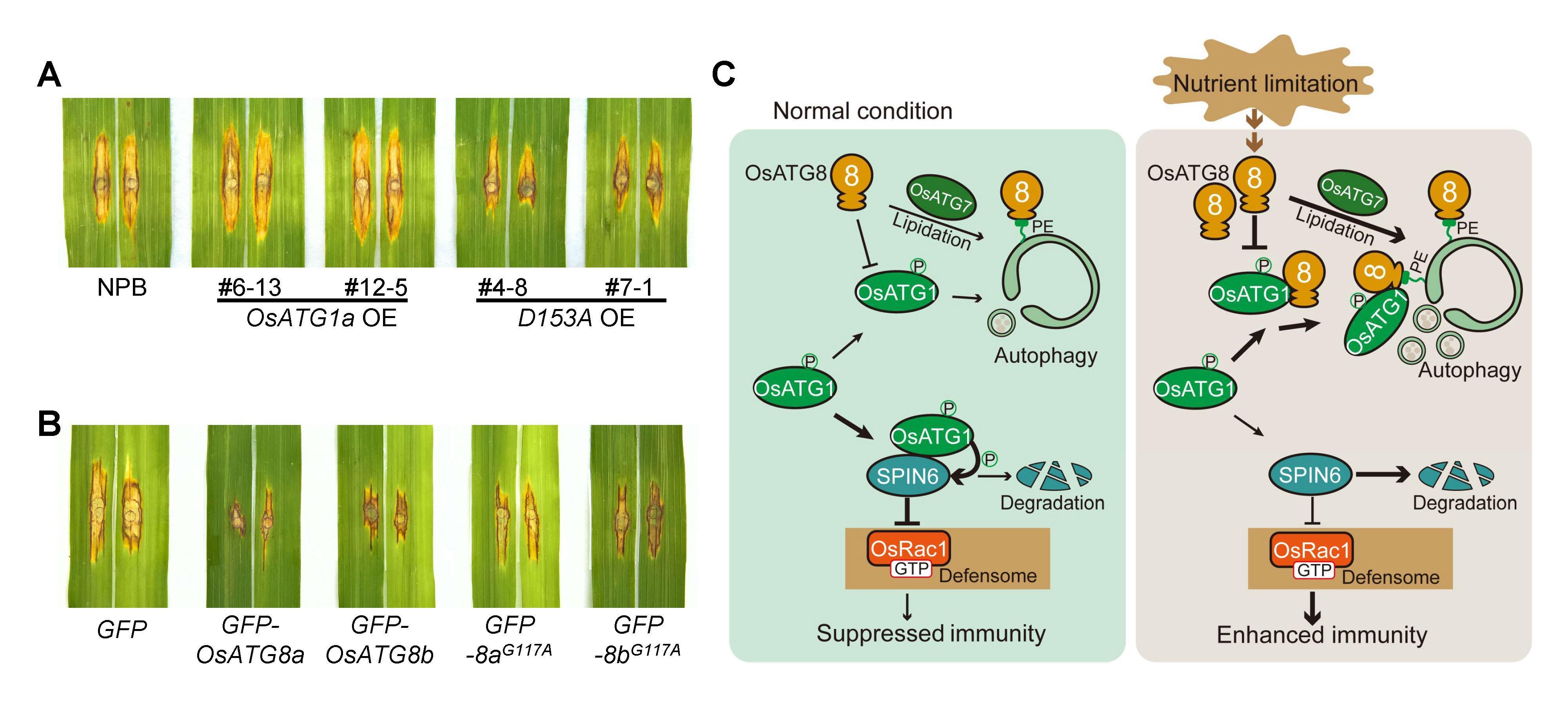 “研究发现自噬标记蛋白受营养胁迫诱导,通过不依赖于自噬途径动态调控水稻免疫反应,在分子水平建立了营养状态与免疫应答的直接关联。研究拓展了对自噬组分功能的传统认知,绘制了营养-免疫调控模型,为作物抗病育种提供了新思路。”宁约瑟说。