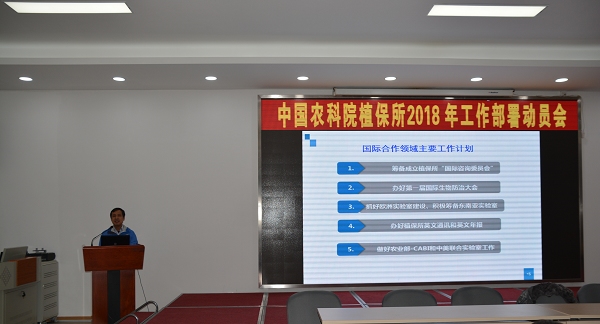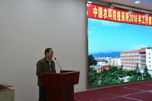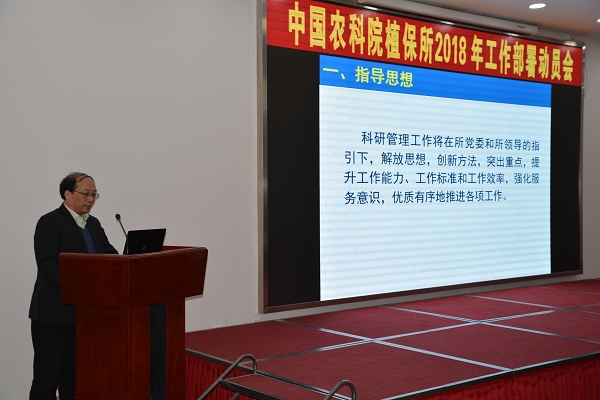 会上,周雪平所长做《深入贯彻落实党的十九大精神,努力开创新时代植保所工作新局面》的工作报告。周雪平所长指出,2018年是全面贯彻落实党的十九大精神的开局之年,是改革开放40周年,实施“十三五”规划承上启下的关键一年,也是我所全面推进科技创新工程和建设世界一流院所的关键之年。全所干部职工要把握新时代发展机遇,聚焦生态文明建设和实施乡村振兴战略总体要求,以科技创新思想指导新时代农业科技工作。
