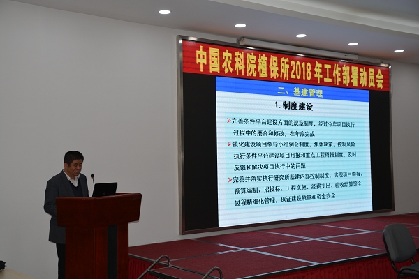 周雪平所长对我所2018年各项工作提出八项部署:一要不断加强领导班子建设。加强政治理论学习,增强大局意识、责任意识、担当意识,提升领导素质和战略规划能力。二要不断加强人才队伍建设。进一步解放思想、创新人才工作机制,稳定科研、管理、支撑人才队伍,坚持精准引进和柔性引进人才,做到感情留人、事业留人、待遇留人。三要不断强化创新工程的引领地位。切实把创新工程作为新时期推进研究所改革发展的一号工程,建立以创新工程为牵引的资源配置、绩效管理机制。认真完成院所创新团队发展水平的科学评估。合理调整科研工作方向,围绕重大科技命题,创新培育标志性成果,提出系统性解决方案,将实现重大科技创新特别是协同创新放在首位。四要加大重大成果推广转化力度。不断强化我所成果转化技术集成示范,做强科技产业。五要加大科技平台与基础设施建设力度,不断完善野外试验基地建设。六要强化农业科技国际合作,推进与世界顶尖大学及研究机构的实质性合作。七要切实加强研究所管理。2018年是农科院管理效益年,我所要立足现代院所建设要求,坚持新发展理念,坚持以人为本,以管理体系和管理能力现代化为导向,提升管理监督和服务意识,不断加强支撑保障能力。八是坚持全面从严治党,强化党的建设和党风廉政建设,营造良好科研生态环境。
