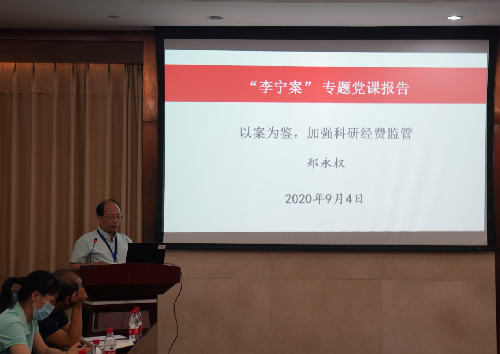 纪委书记、副所长郑永权以“以案为戒,加强科研经费监管”为题给大家上了一堂深刻的廉政警示教育党课。郑永权简要介绍了“李宁案”的案情和犯罪事实;分析了“李宁案”反映出的主要问题,经费管理中容易出现失管的风险点;明确研究所要以案为鉴,加强科研人员风险防控教育,加强完善制度建设,加强信息化建设,加强日常监督检查;强调全所科研人员要提高三个认识:科学家要正确定位,防止不受监管的“老板”出现;公私分明的底线要坚持;在“潜规则”面前要清醒。随后科研人员代表、植物病害研究室主任刘文德同志,科研项目管理人员代表、科研管理处处长张礼生同志,财务管理人员代表、财务管理处处长杨茜同志分别结合具体工作实际,交流了 “李宁案”的学习思考与心得体会。
