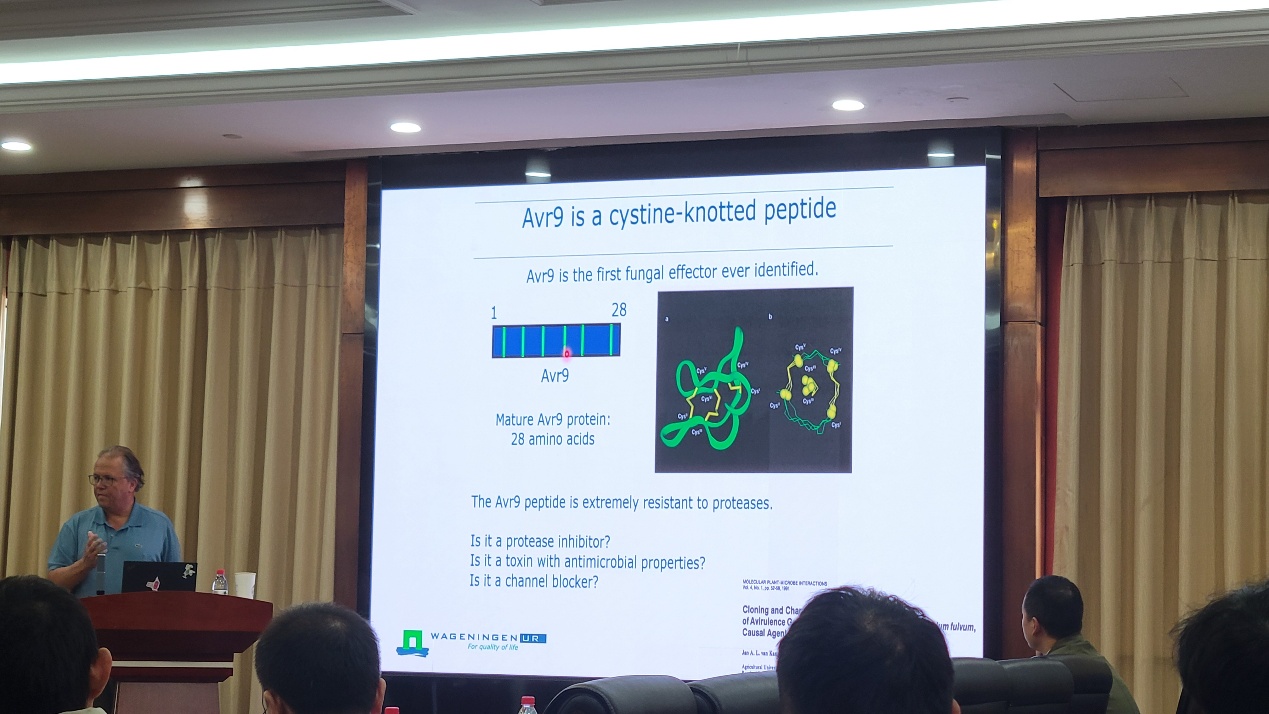 Joosten教授的报告深入解析了番茄抵御叶霉病的核心免疫机制。他们团队的研究揭示了类受体激酶SOBIR1是番茄Cf抗病蛋白的关键因子,负责特异性感知叶霉病菌效应子,实现了从病原菌“识别”到细胞内“信号转导”的关键转换,为理解植物细胞表面免疫受体的机理提供了经典范式。随同Joosten教授来访的两位瓦赫宁根大学博士研究生分别介绍了他们在番茄Cf蛋白下游转录因子和细胞内受体激酶通路的免疫信号传导领域的最新探索,与在场师生进行了深入交流。