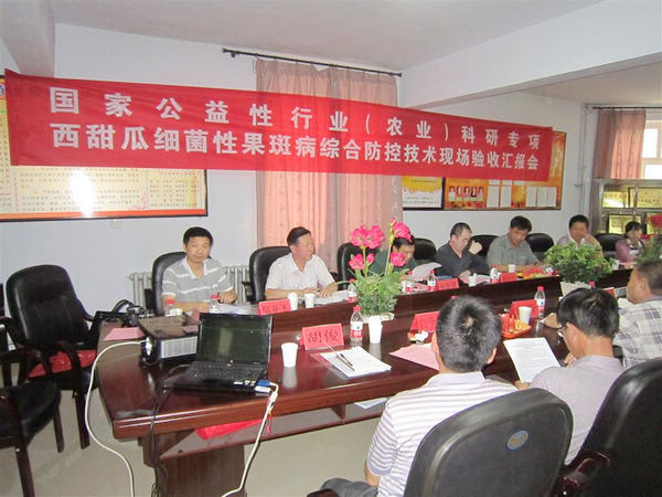 2013年7月14日,国家公益性行业(农业)科研专项“西甜瓜种传细菌性果斑病综合防控技术研究与示范”项目现场验收会在内蒙巴彦淖尔市隆重召开。中国农业科学院植物保护研究所张步江书记、巴彦淖尔市农牧科学院温埃清院长等领导出席会议并讲话。验收专家组全国农业技术推广服务中心张跃进研究员(组长)、赵中华研究员、中国农业大学王琦教授、内蒙古农牧业科学院白全江研究员、内蒙古植保植检站白音高级农艺师出席会议,对示范现场进行了验收,并听取了项目组的汇报。巴彦淖尔市各旗县区农业局相关负责人及部分项目组成员参加了会议。中国农科院植保所科研处邹亚飞副处长主持会议。
