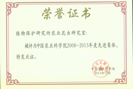 在刚刚召开的中国农业科学院2014年工作会议上,我所农业昆虫研究室被评为中国农业科学院2008~2013年度先进集体。