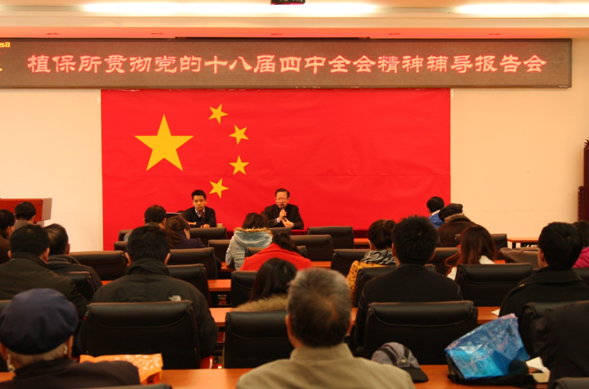 韩春晖教授以全面推进依法治国,坚持中国特色社会主义法治道路为题,从十八届四中全会的意义、四中全会决议起草过程及框架、推进依法治国的目标及道路、推进依法治国的六项任务等四个方面,深入解读了十八届四中全会精神。张步江书记对韩春晖教授的报告做了总结点评,并对全所党员干部提出三点要求:一是充分认识十八届四中全会的重大意义,深刻领会十八届四中全会精神,加强对农业科研经费使用方面的法制意识;二是以支部为单位,认真组织一次学习研讨会,深入学习贯彻十八届四中全会精神,加深对《中共中央关于全面推进依法治国若干重大问题的决定》的认识;三是以十八届四中全会精神为动力,全面落实和推动我所2014年度工作任务的顺利完成,提升工作质量与绩效。